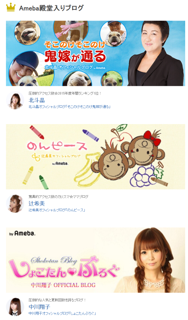 Ameba公式の「殿堂入りブログ」ページに、現在掲載されているのは以下の3名です。